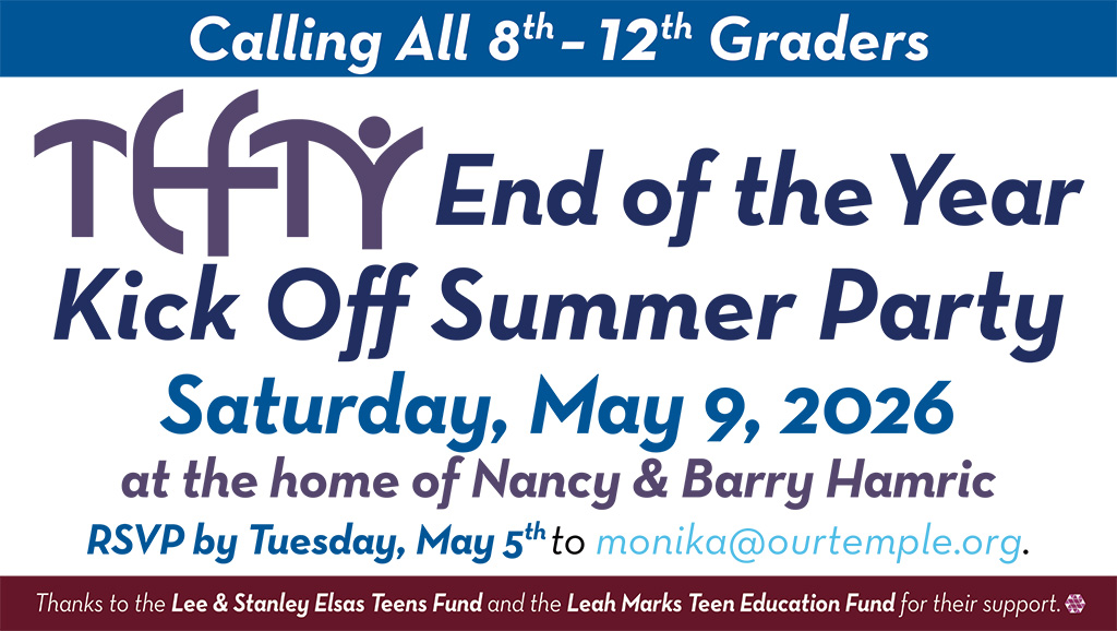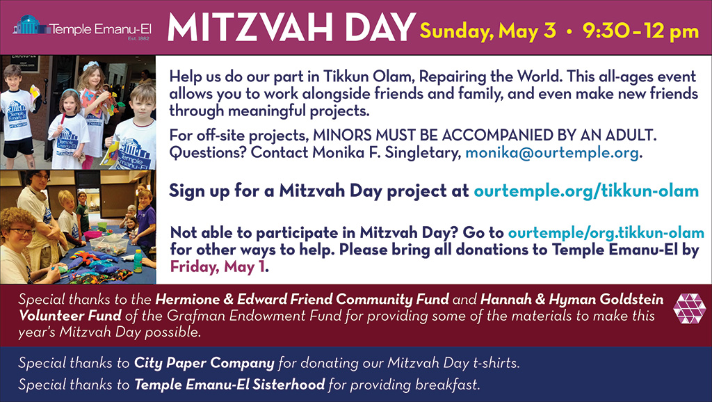 This Week at Temple Emanu-El: Wednesday, April 15 – Sewing Group at 10:00 AM, Mid-Week Hebrew School at 3:45 PM | Friday, April 17 – Erev Shabbat Service at 6:00 PM | Saturday, April 18 – Torah Study at the Temple at 9:00 AM, “Love Pray Eat” Shabbat Morning Service in Hess Chapel at 10:00 AM | Sunday, April 19 – Religious School at 9:30 AM, Brotherhood Bowling at Vestavia Bowl at 3:00 PM.
