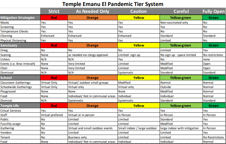 In accordance with the regional/local data and CDC recommendations, we are excited to announce that the temple will loosen its COVID risk tier to the yellow/green category.